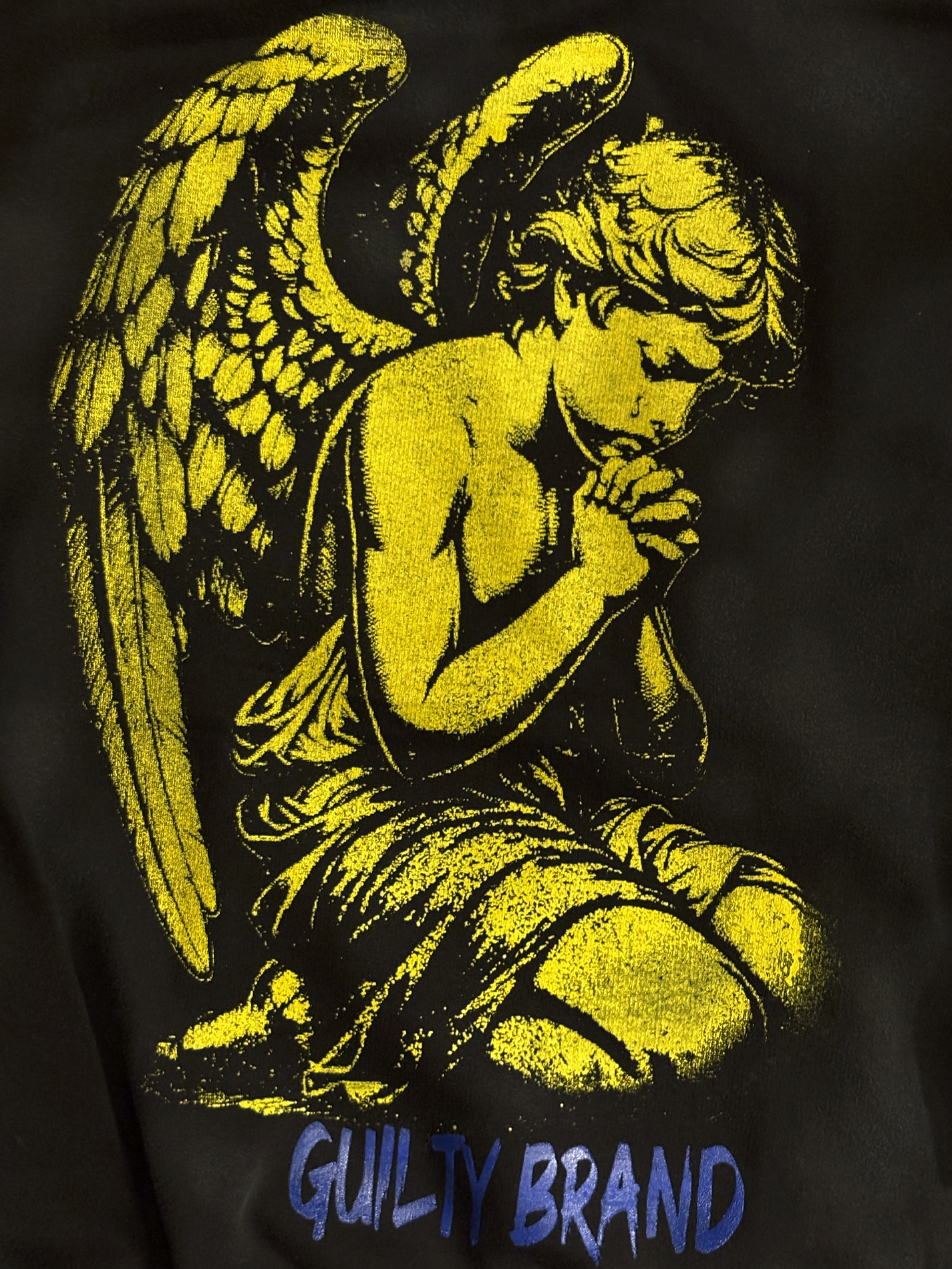 • Vintage yellow ink on washed black garment