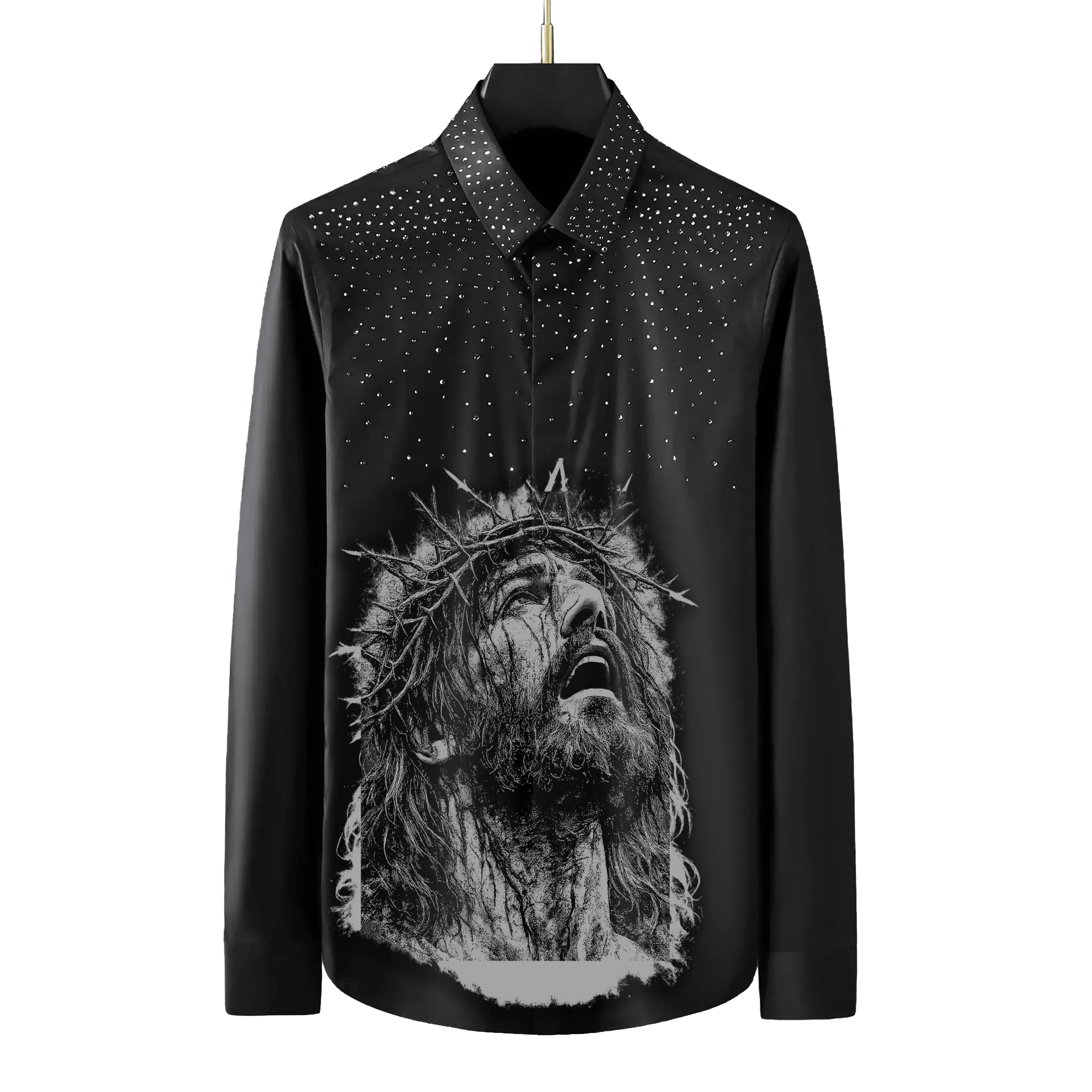 A reverent luxury button-down featuring a crown-of-thorns Christ portrait, finished with subtle crystal detailing for understated brilliance. Designed to honor sacrifice, redemption, and divine strength.
